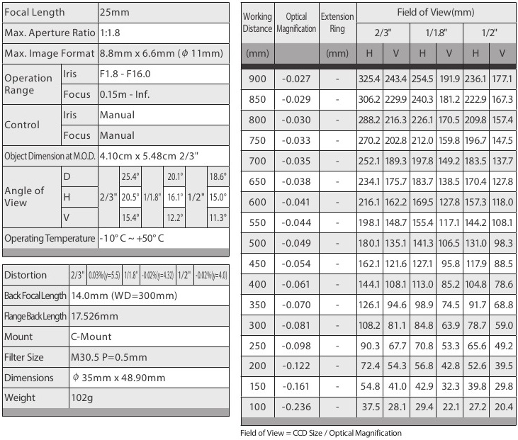 机器视觉镜头,工业镜头,Computar工业镜头M2518-MPW镜头参数: